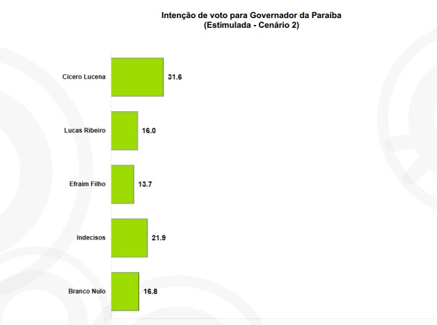No cenário estimulado mais recente, divulgado nesta segunda-feira (06/10), Lucas aparece em segundo. Ele marca 16% das intenções de voto, superando o senador Efraim Filho (União Progressista), que soma 13,7%.